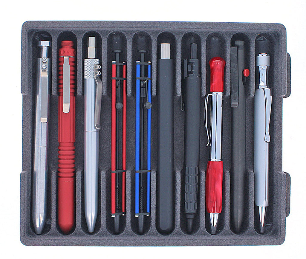 Lot of 10 assorted techno style ballpoint pens - most are mystery models (you will find a Zebra X-701 pen and a Libelle triangular-shaped pen). We'll ship this lot in the pen tray shown in the photo.