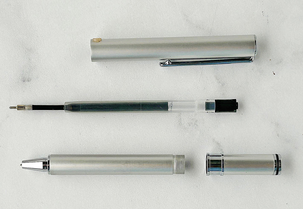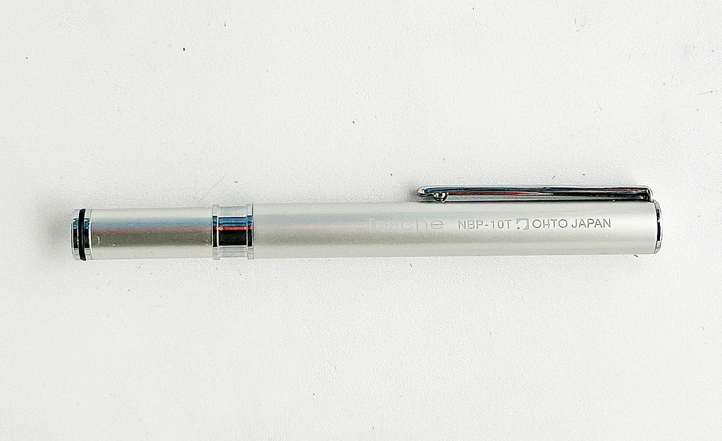 Tasche compact ballpoint pen from Ohto. All metal barrel. Compact 4" when closed and a full sized pen with the cap posted. Ingenious cap design makes the Tasche completely pocket safe - and protects the point. Uses Parker-style ballpoint refills. From Japan.