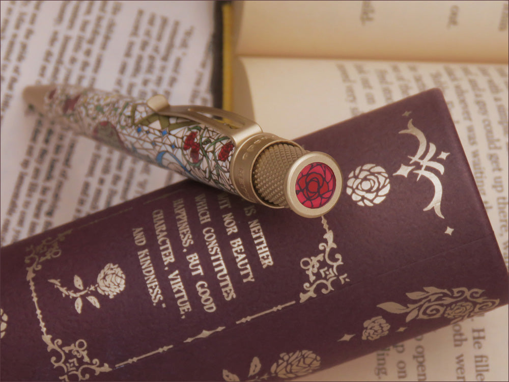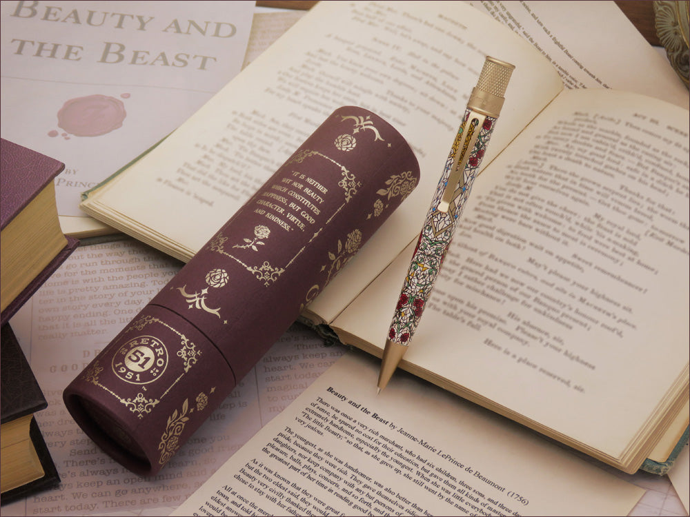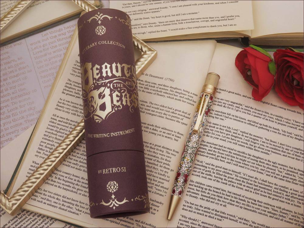 The newest addition to Retro51’s Literary Collection, Beauty and the Beast features a stained-glass–inspired design. The illustrated scene is framed within a heart, capturing Beauty and the Beast alongside the witch’s curse, the enchanted castle, and the iconic rose—symbols of love, transformation, and the passage of time. Accented with cream-gold metallic trim and topped with a sculpted rose finial, this rollerball pen is housed in a burgundy collector’s tube with gold foil details—regal, refined, and ready to be treasured.